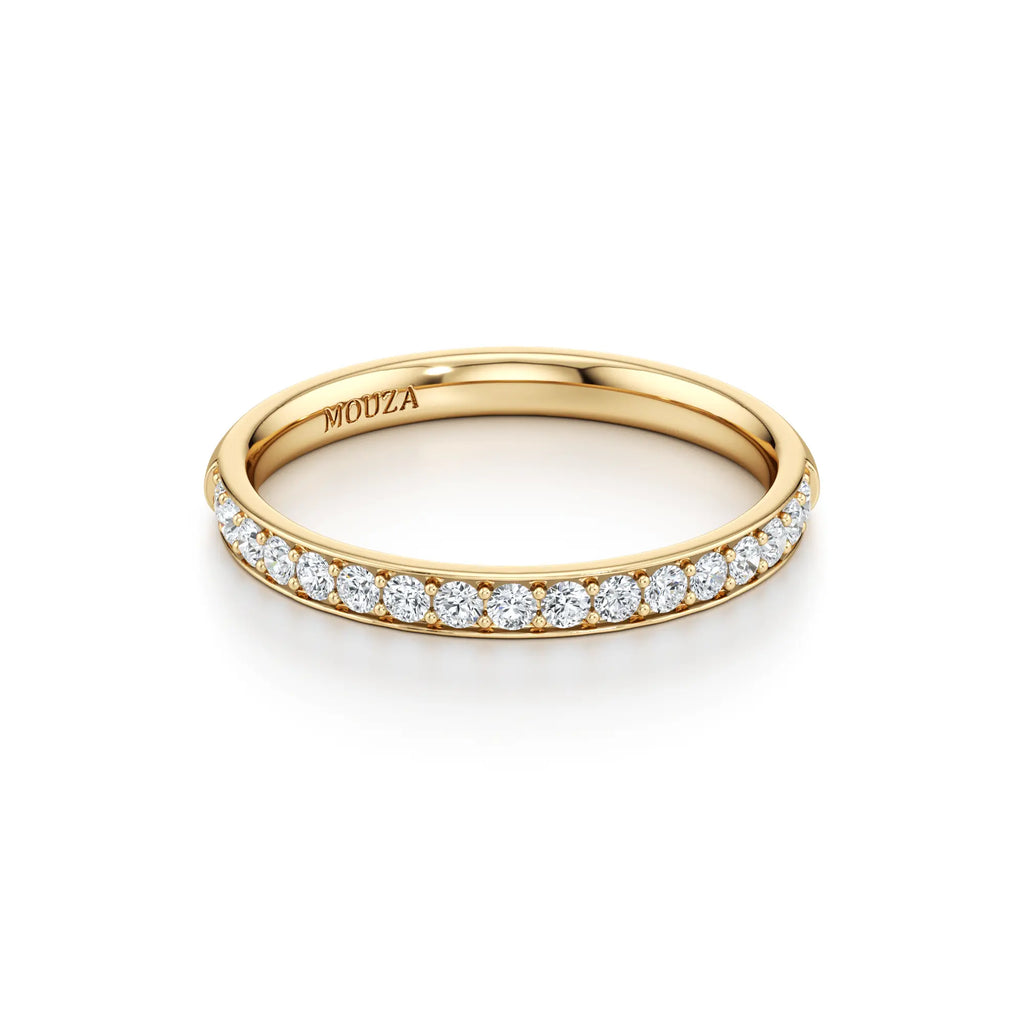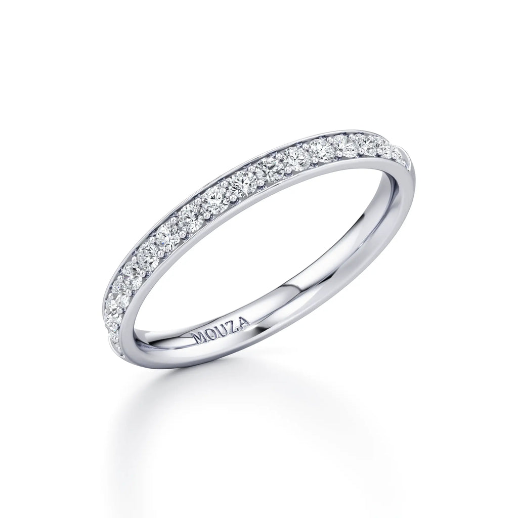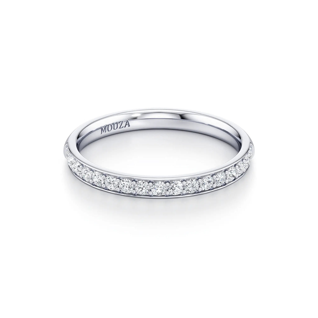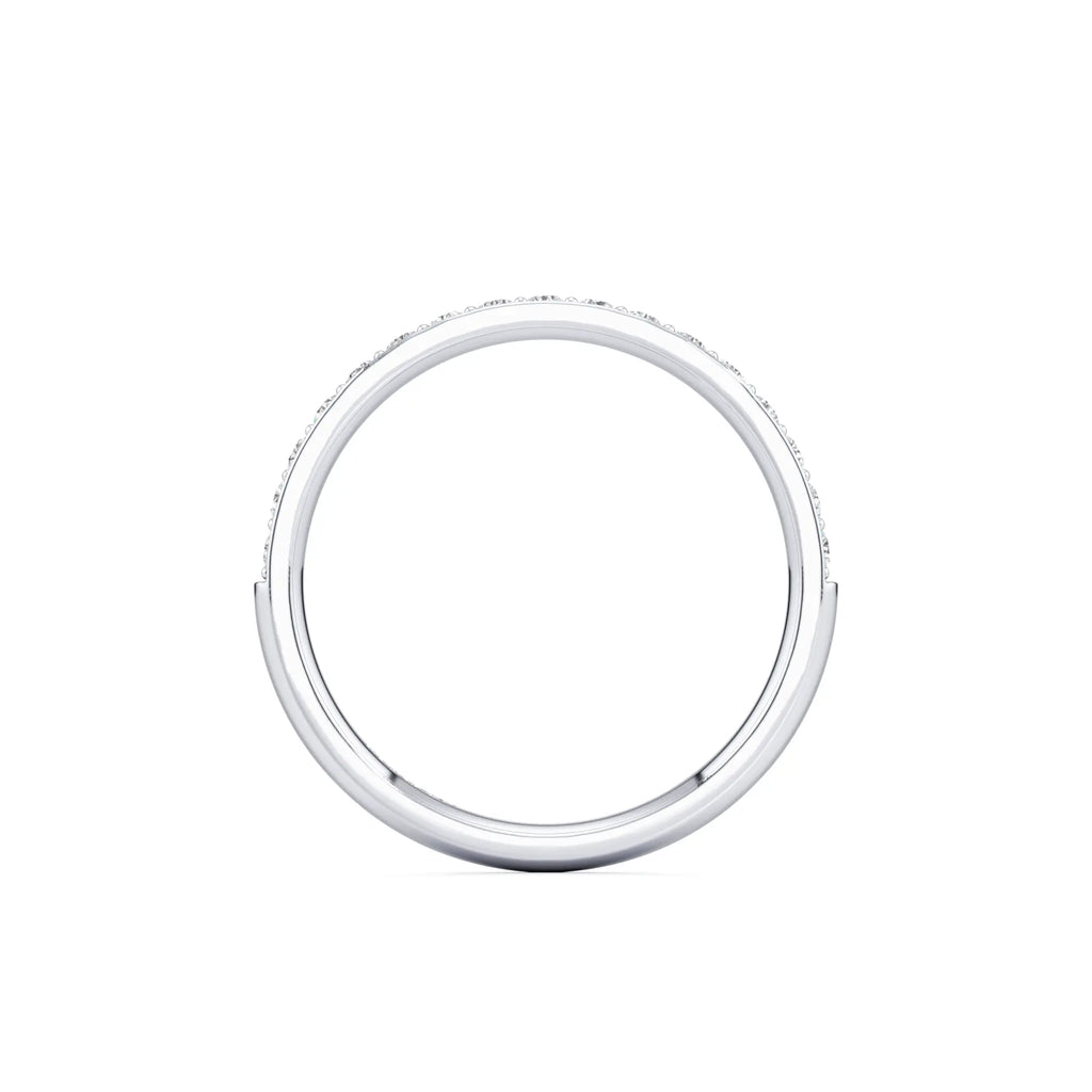 Nadina is a classic pavé wedding band with a slim 2mm profile. The round brilliant diamonds are set closely together within a delicate row, offering a continuous shimmer that wraps elegantly around the finger. Its refined width makes it easy to stack with almost any engagement ring style while maintaining a low-profile and comfortable fit.