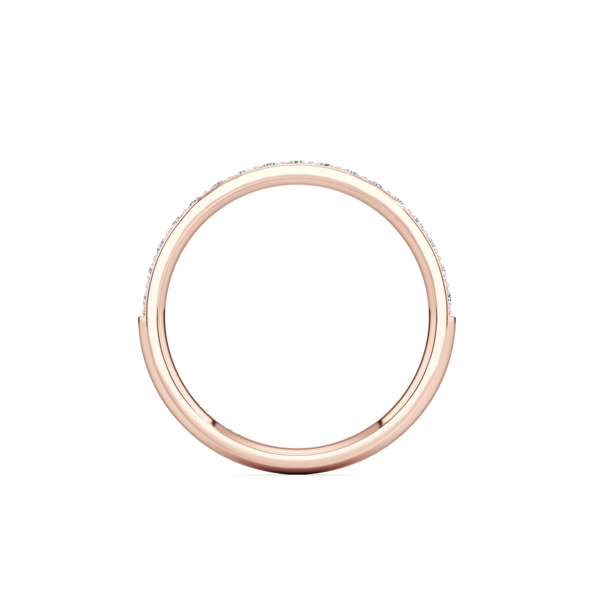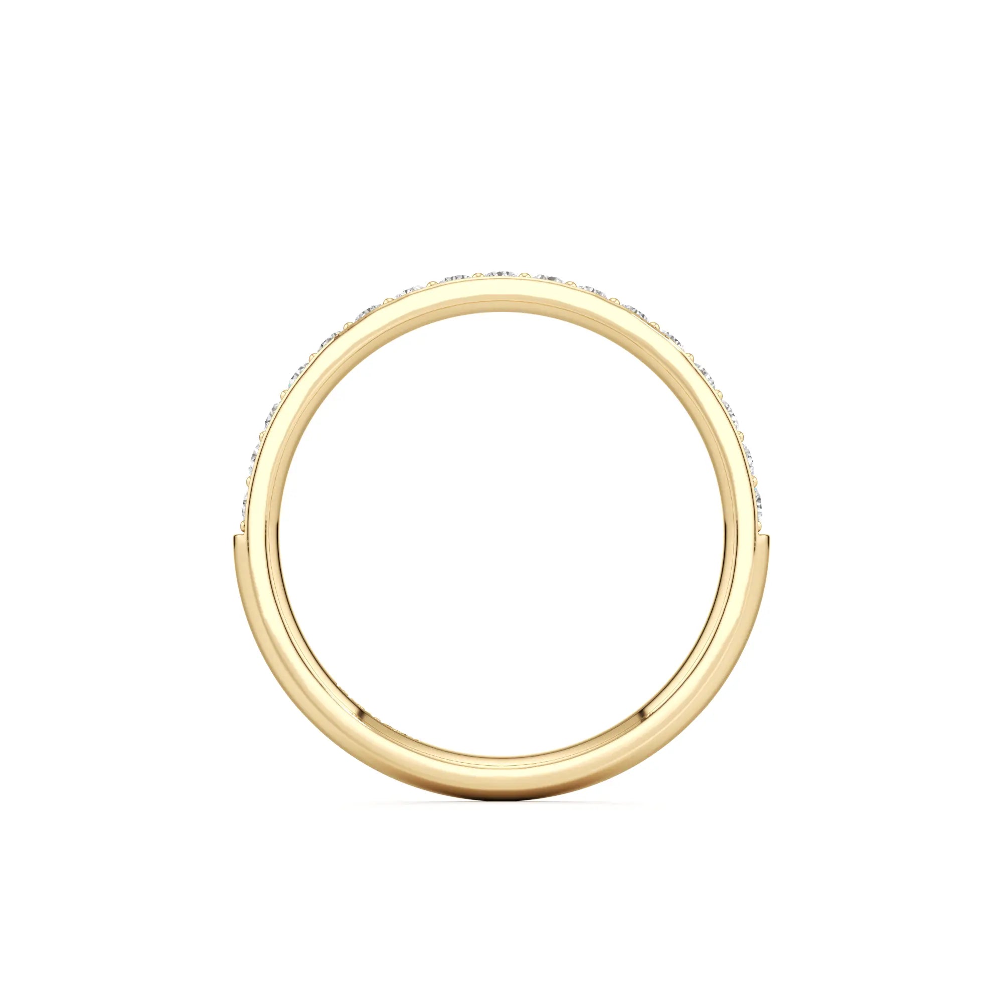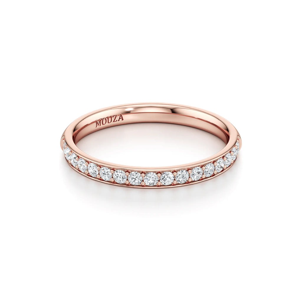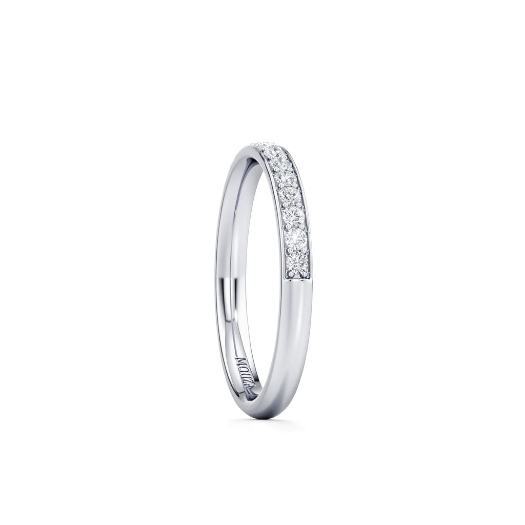 Nadina is a classic pavé wedding band with a slim 2mm profile. The round brilliant diamonds are set closely together within a delicate row, offering a continuous shimmer that wraps elegantly around the finger. Its refined width makes it easy to stack with almost any engagement ring style while maintaining a low-profile and comfortable fit.